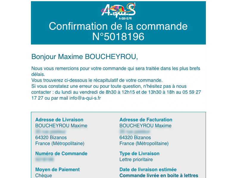 Confirmation de commande
